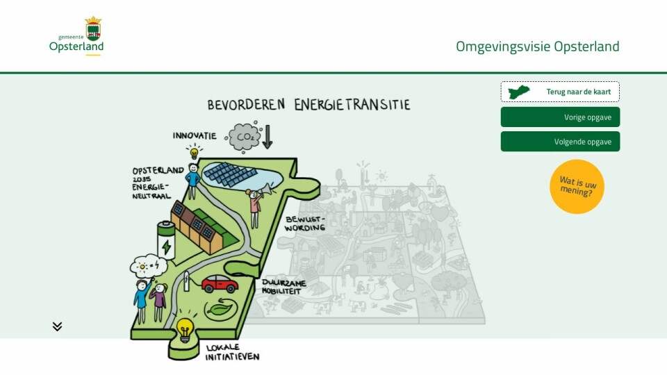 Opsterland wil in 2035 een energie-neutrale gemeente zijn. Dat betekent dat in 2035 net zoveel duurzame energie wordt opgewekt als verbruikt. Dit kunnen wij als gemeente niet alleen. We hebben daarbij hulp nodig van inwoners, bedrijven, organisaties en plaatselijke belangen.